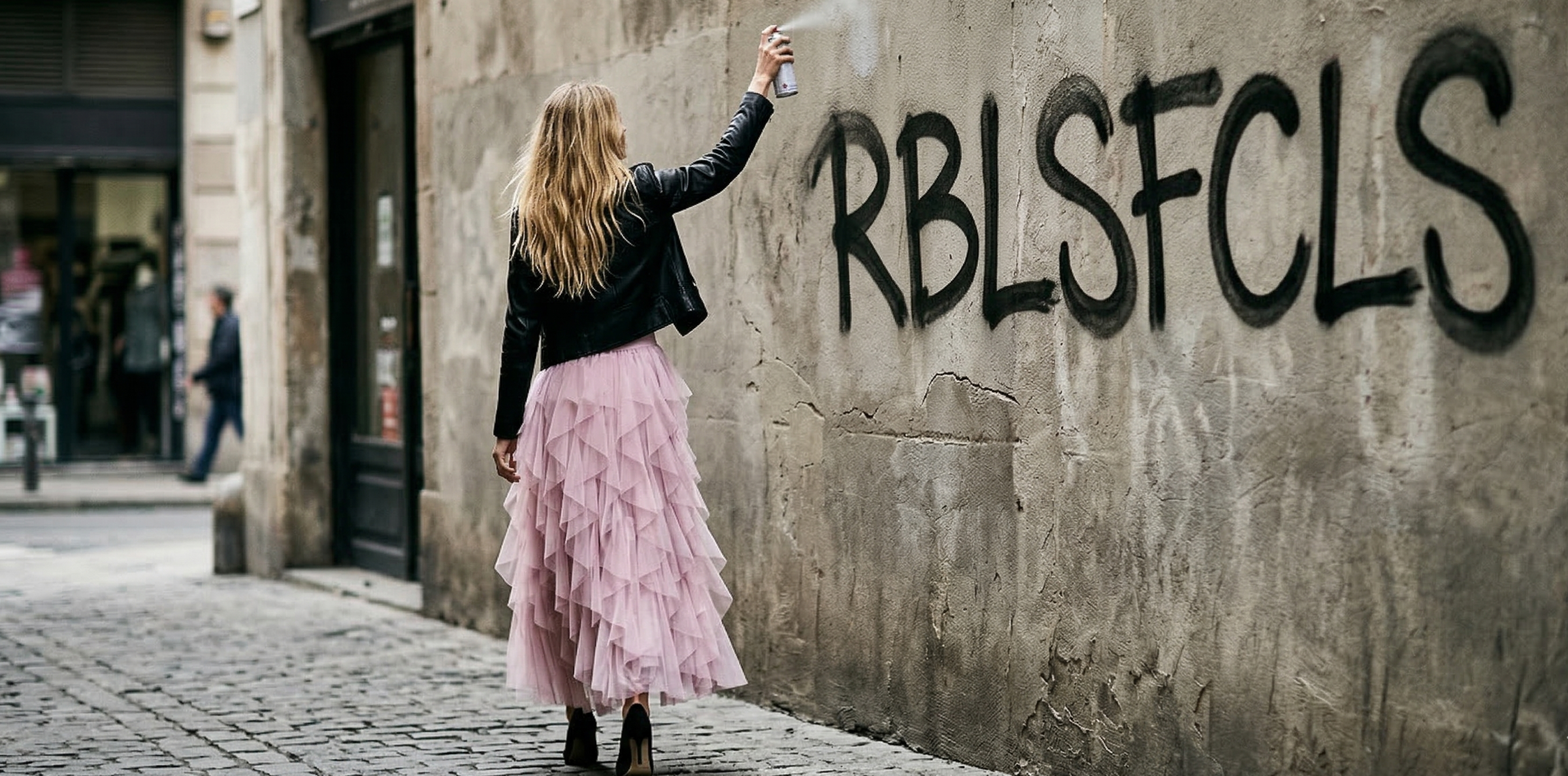 To reduce waste from traditional photo shoots and excess production, RBLSFCLS uses AI-generated editorial imagery while producing garments on demand.